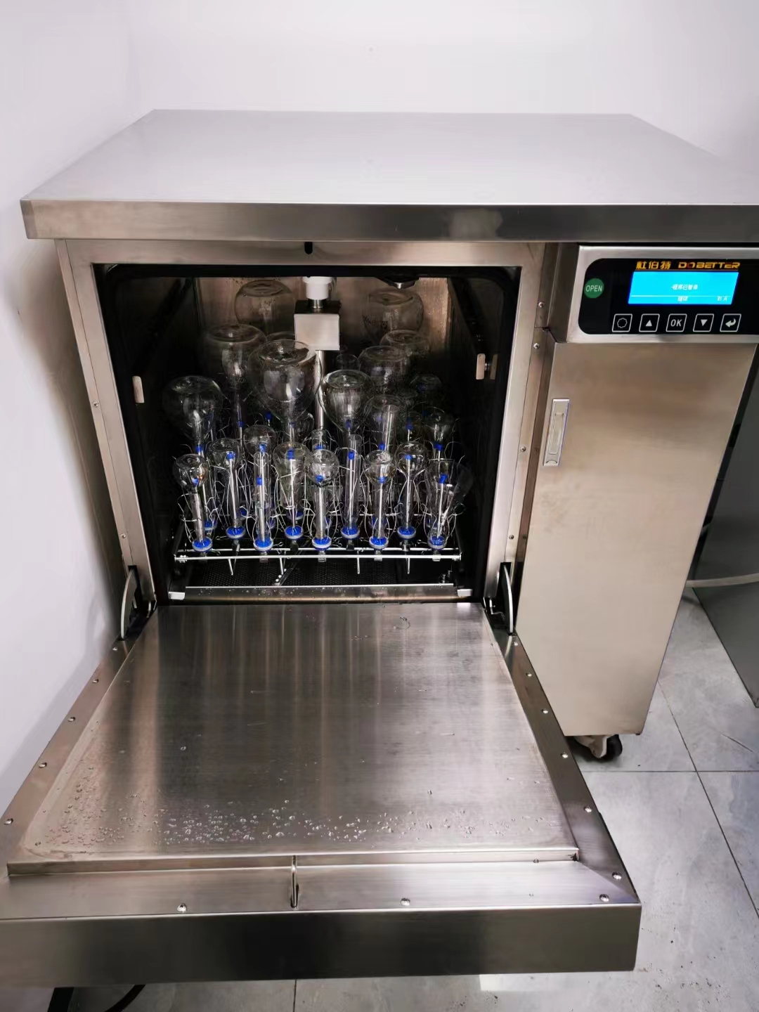 (2)清洗量大,省時省力;人工洗瓶難以實現批量化清洗,而一臺杜伯特洗瓶機一次可洗百余只瓶皿,操作簡單,只需把污染的滴定管放在清洗籃架上,選定好程序,啟動設備。如果選用標準程序清洗,45分鐘左右就能洗完。人工清洗大半天的器皿,杜伯特不到1小時就搞定。